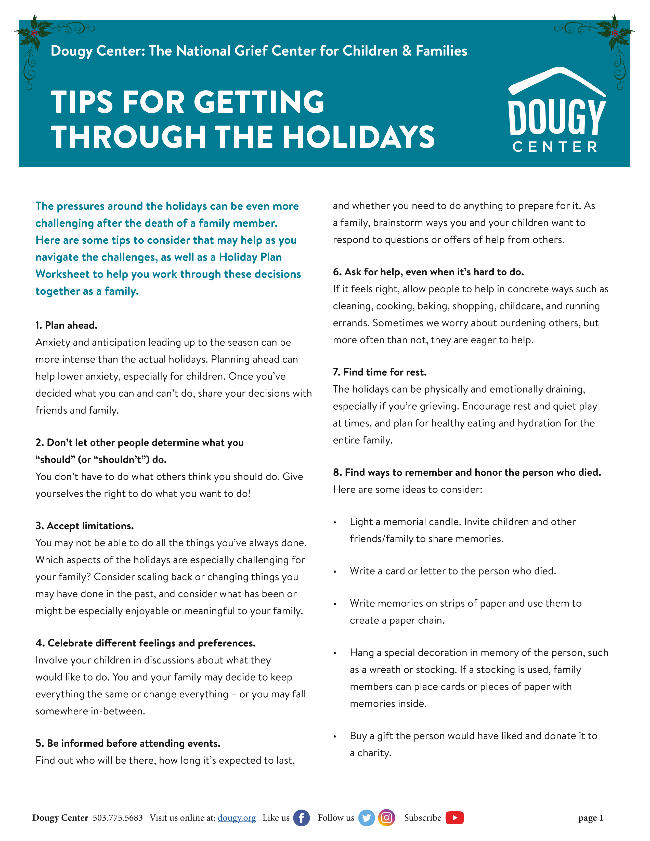 Find additional tips on grieving during the winter holidays and a holiday plan worksheet here.