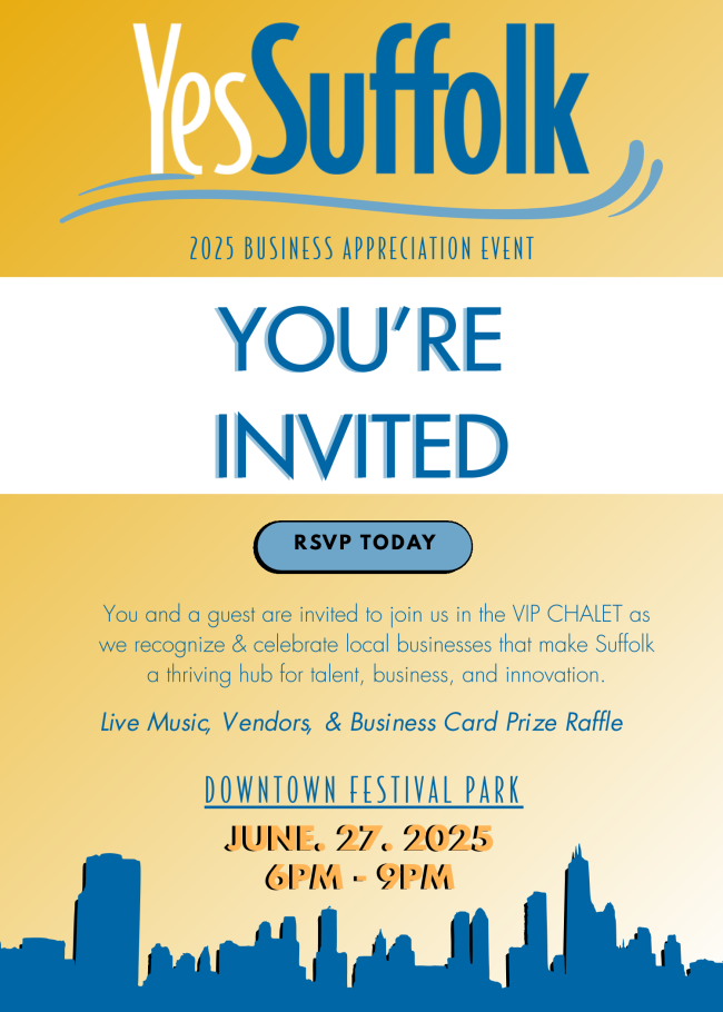 If you are a Suffolk Business Owner we hope you will join us for Suffolk Economic Development's 2025 Business Appreciation Night! This year the event is being held at the Downtown Festival Park (215 W. Washington Street).