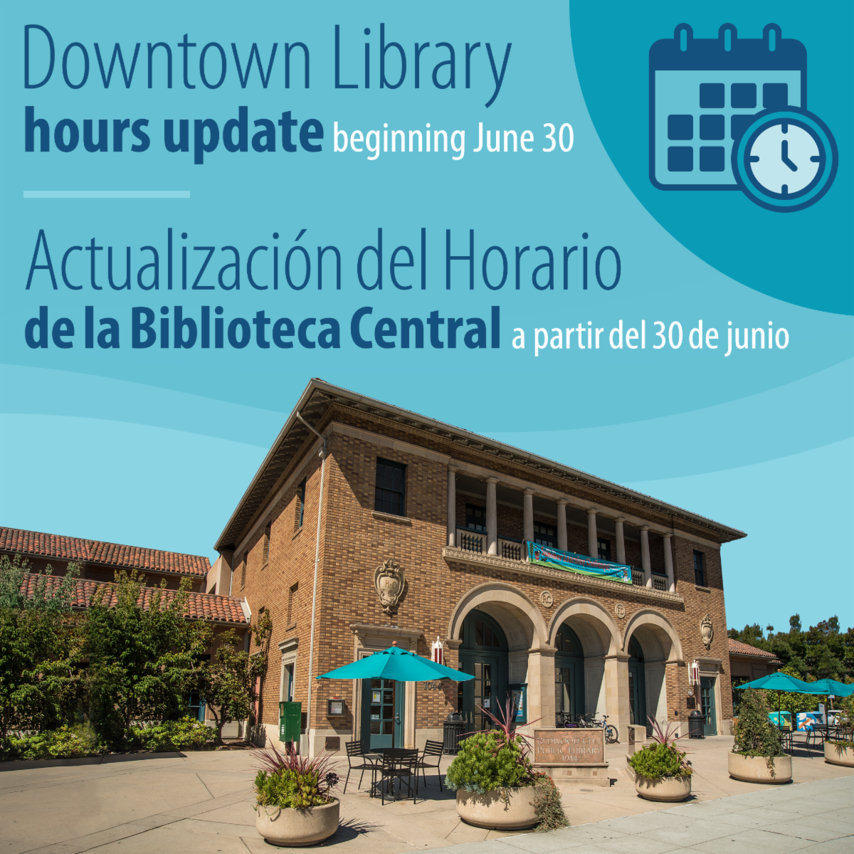 A partir de la próxima semana, la Biblioteca Central cerrará una hora más temprano, de lunes a jueves, a las 8:00 p.m. El horario de viernes a domingo en la Biblioteca Central seguirá siendo el mismo, al igual que el horario semanal en la Sucursal Biblioteca Redwood Shores y la Surcursal Biblioteca Schaberg. Este cambio nos permite alinear mejor al personal con los horarios de mayor uso y garantizar un excelente servicio al cliente cuando más se necesita. Nuestros datos muestran que la última hora del día ha sido consistentemente la más tranquila, y este ajuste nos ayuda a utilizar nuestros recursos de manera más eficiente. Gracias por su comprensión y continuo apoyo mientras adaptamos las operaciones de la Biblioteca para servirle mejor.