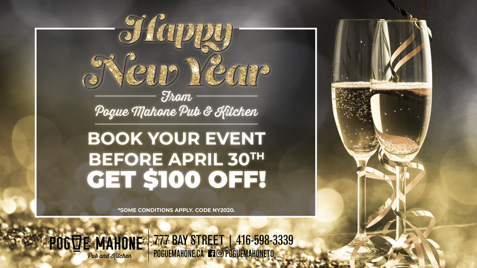 January is the new December! Book your next event with us at Pogue Mahone between now and April 30th and get $100 off your minimum spend! Whether you're hosting a late holiday party or just want to get the gang together, Pogue Mahone is the perfect venue right in the heart of the city! Give us a call at 416-533-8368 and mention code NY2020 to redeem!
