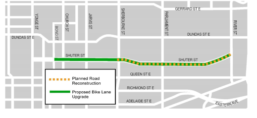 The City of Toronto has planned road reconstruction on Shuter Street in 2020. This work presents an opportunity to evaluate the configuration of the roadway and consider changes that will improve the safety of all road users. Proposed safety improvements include replacing the existing bike lanes on Shuter Street with separated bike lanes (cycle track) from Bond Street to River Street. In addition to the bike lane upgrade, the City is planning pedestrian safety improvements at several intersections. The City invites residents to learn more about the planned road work and proposed bike lane upgrade, and to provide feedback on the proposed road design.