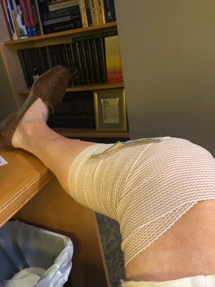 I'll confess I took a lot of flak when I shared this photo on Facebook, my knee comfortably resting on my desk not too long after surgery! So this is definitely a case of "Do as I say, not as I do," but I wanted to share my experience with you and give kudos to the staff at Seaside. Here's what I wrote: