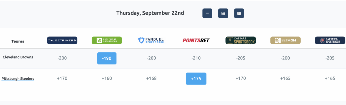 Also like last week, DraftKings' odds for the underdog Pittsburgh is well behind the rest of the market. Pittsburgh is as high as +180 on FanDuel, Caesars and BetMGM. DK does offer the best line on Cleveland at -190, however, making the favorite not a bad play for this promotion. We expect these lines to fluctuate a bit before kickoff, so keep an eye on the NFL moneyline Game Board for updated odds.