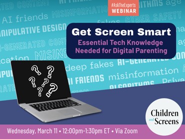 Join us for our #AskTheExperts webinar “Get Screen Smart: Essential Tech Knowledge Needed for Digital Parenting” on Wednesday, March 11 from 12:00pm ET-1:30pm ET.