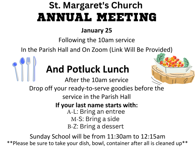 Jan 25- Services at 7:30am and 10am, Annual Meeting at 11am, Sunday School 11:30am-12:15pm