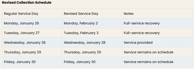 | | County Trash and Recycling Service Update | | Please see the below updated collection schedule, customer accommodations, and safety protocols being implemented for County Trash and Recycling customers in light of Winter Storm Fern. During the inclement weather, curbside trash, recycling and Special Pickup services were suspended Monday, January 26, and Tuesday, January 27. | | |