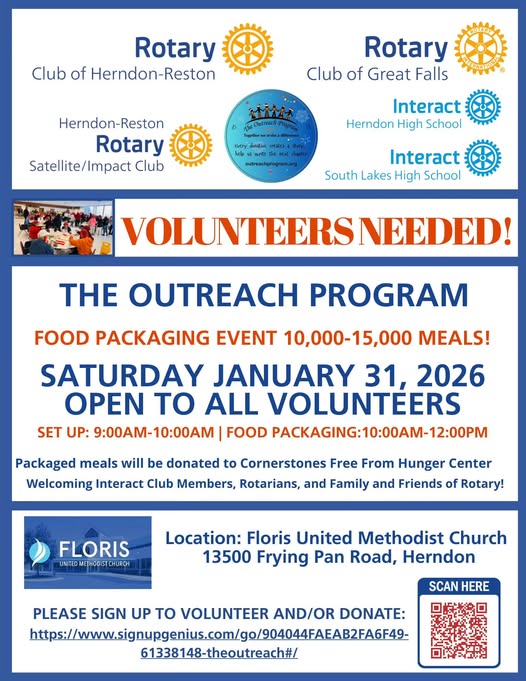 The Rotary Club of Herndon-Reston, Rotary Club of Great Falls, Interact Club of Herndon High School and South Lakes, and The Outreach Program, will gather at Floris United Methodist Church to package 10,000–15,000 meals for families in need.