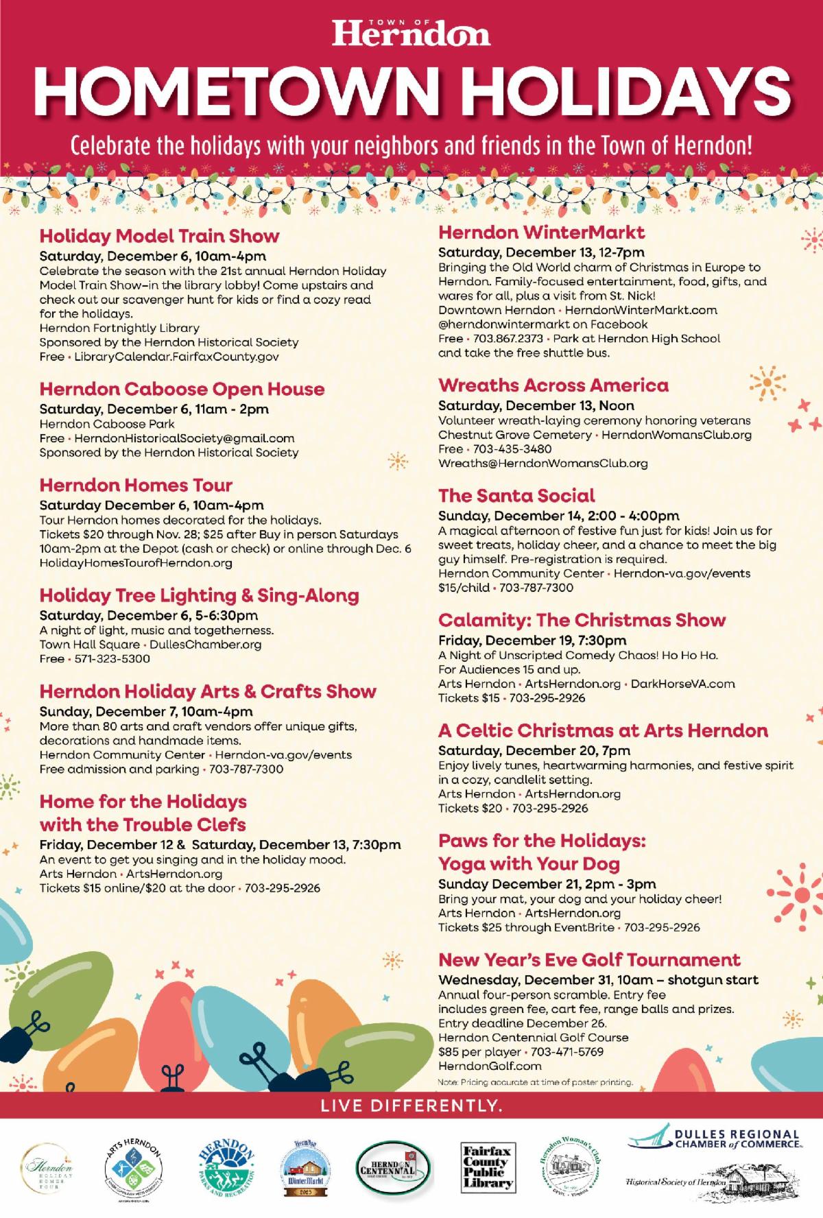 | | Herndon Hometown Holidays | | The Town of Herndon's Hometown Holidays has a number of upcoming festivities for all ages. This weekend, they will have the Holiday Model Train Show, Herndon Caboose Open House, Herndon Homes Tour, Holiday Tree Lighting & Sing Along, and the Herndon Holiday Arts & Crafts Show. Celebrate the holiday season with your neighbors and friends in the Town of Herndon! | | Arts of Great Falls Upcoming Events | | |