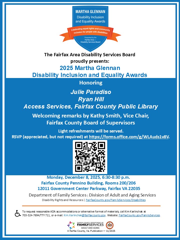 The Fairfax Area – Disability Services Board’s Martha Glennan Disability Inclusion and Equality Awards are presented annually to recognize people, businesses, nonprofits, government agencies, and other organizations that excel in demonstrating a commitment to promoting equal rights and community inclusion for people with disabilities in the Fairfax area and how people with disabilities have significantly benefitted from their efforts. RSVP (appreciated, but not required) here.