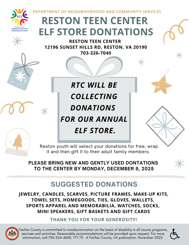 - Dec. 8: Reston Teen Center Elf Store Donation Deadline