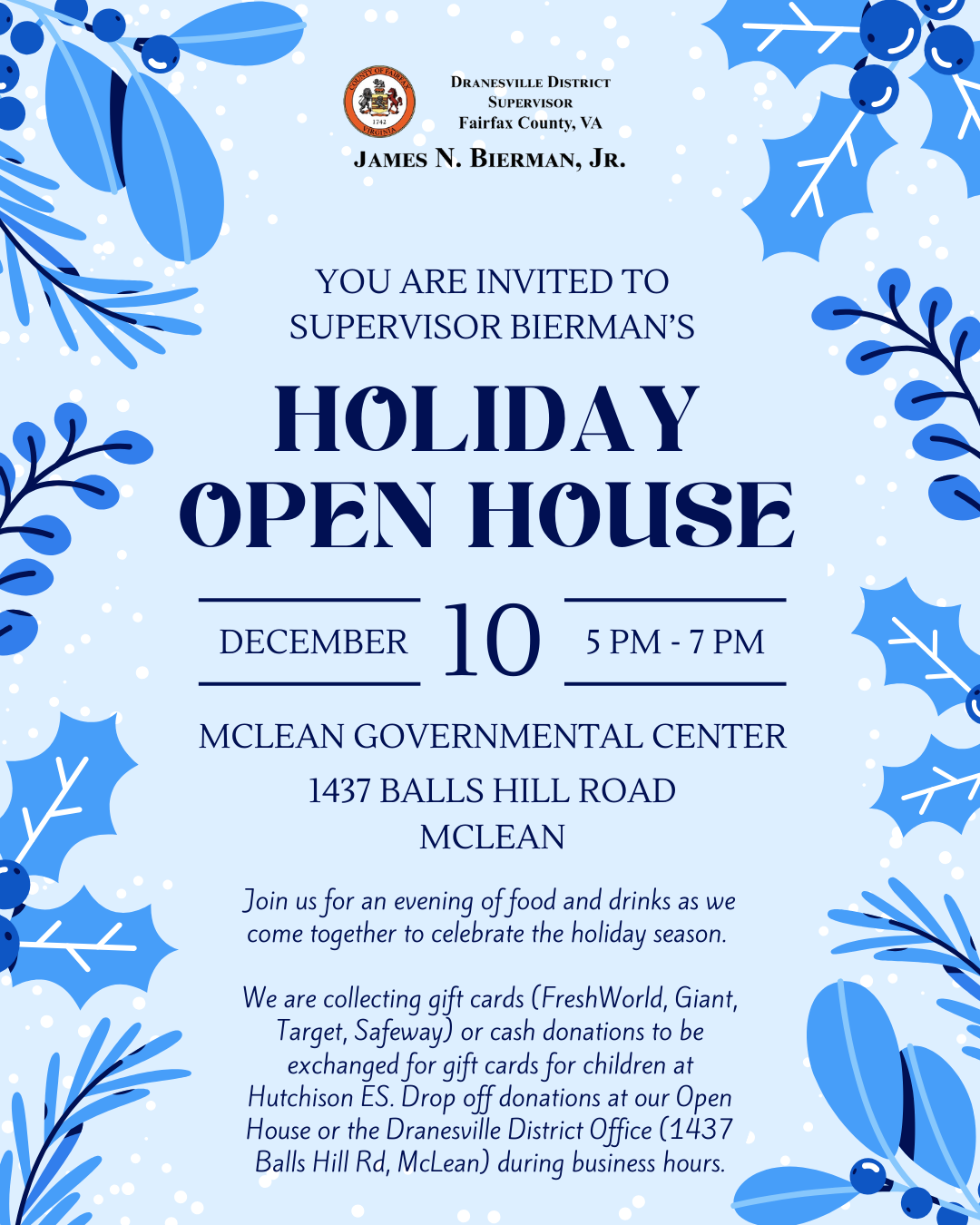 As part of the celebration, Supervisor Bierman is collecting donations to benefit children in need at Hutchison Elementary School. Preferred items include $10 gift cards (FreshWorld, Giant, Target, Safeway), or cash donations to be exchanged for gift cards. Donations can be brought to the Open House or delivered during regular business hours to the Dranesville District Office at 1437 Balls Hill Rd, McLean.