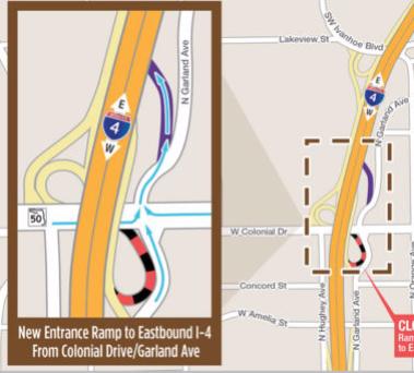 A new ramp from Garland Ave. to eastbound I-4 opened earlier this month. This replaces the loop ramp from Colonial Drive. (SR 50) and increases access to I-4 East for drivers on Colonial Dr. and Garland Ave. For more information, click
