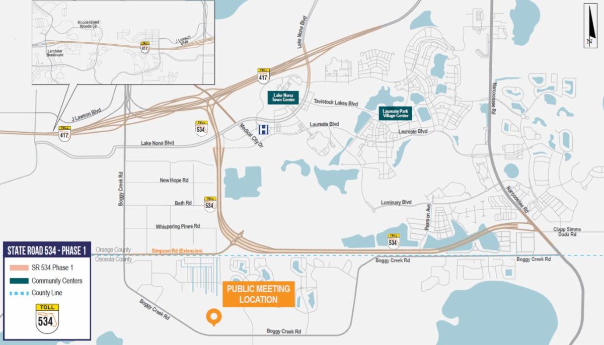 CFX is holding a public meeting for design of Phase 1 for State Road 534 . Phase 1 is a 5-mile section from SR 417 near Boggy Creek Road to Narcoossee Road and it is part of the SR 534 expressway. The entire SR 534 project is a 14-mile regional transportation network that will support the current and projected transportation needs in Southeast Orange and Northeast Osceola counties.