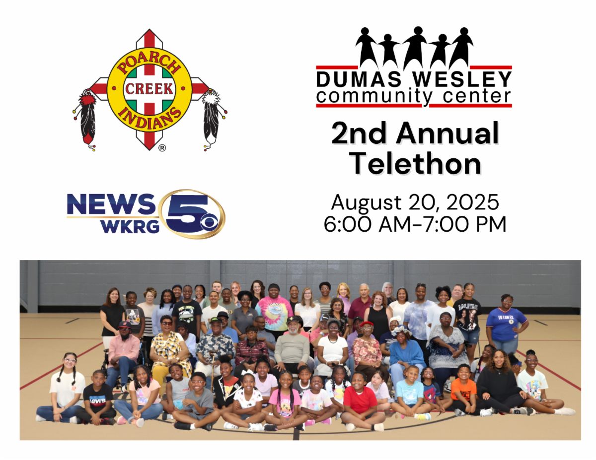 The Dumas Wesley Community Center is proud to announce the return of its Annual Telethon – made possible through the generous support of the Poarch Band of Creek Indians and WKRG-TV. The 2nd Annual Telethon will take place on Wednesday, August 20, 2025. WKRG-TV will broadcast the day-long Telethon from 6:00 A.M. to 7:00 P.M., featuring live interviews, inspiring stories and special guests.