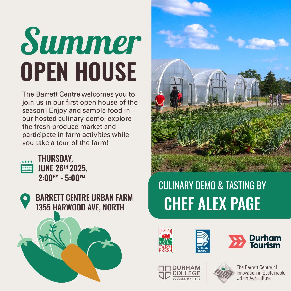 | | Barrett Centre Open House | | The Barrett Centre is hosting its first open house of the summer season at its urban farm in Ajax. On June 26 from 2 to 5 p.m., take part in farm activities while touring the farm. Sample from a culinary demo by Chef Alex Page and shop at the fresh produce market. Learn more about the Barrett Centre. | | |