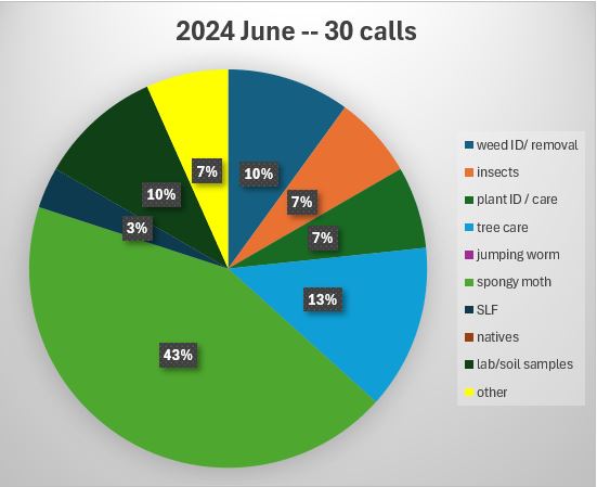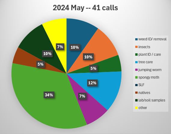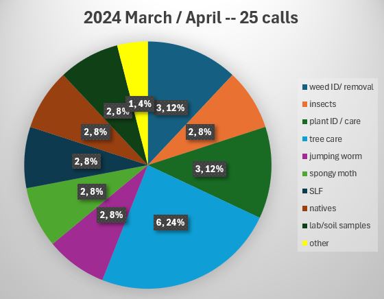 | | Sue Ciafrani, Master Gardener, Class of 2025 | | Above are the topics for the Hotline calls we received from the public in the early part of 2024. | |