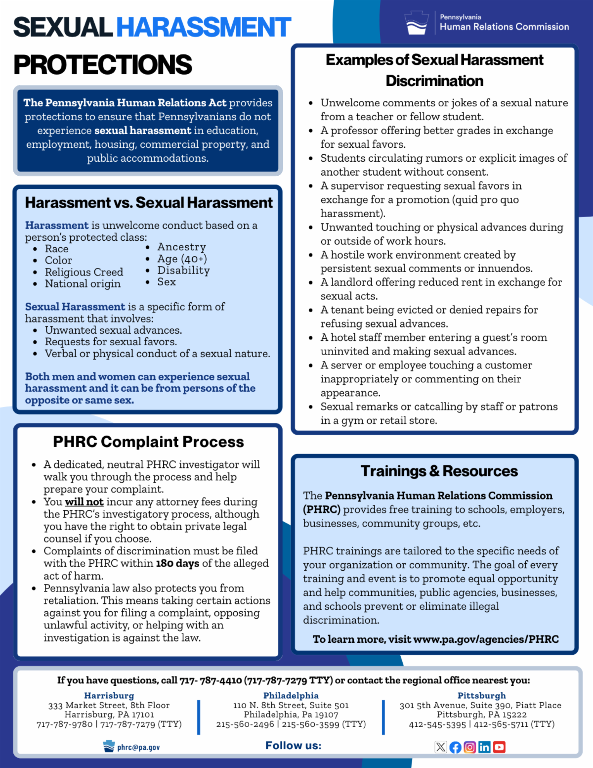 The Pennsylvania Human Relations Act provides protections to ensure that Pennsylvanians do not experience sexual harassment in education, employment, housing, commercial property, and public accommodations.