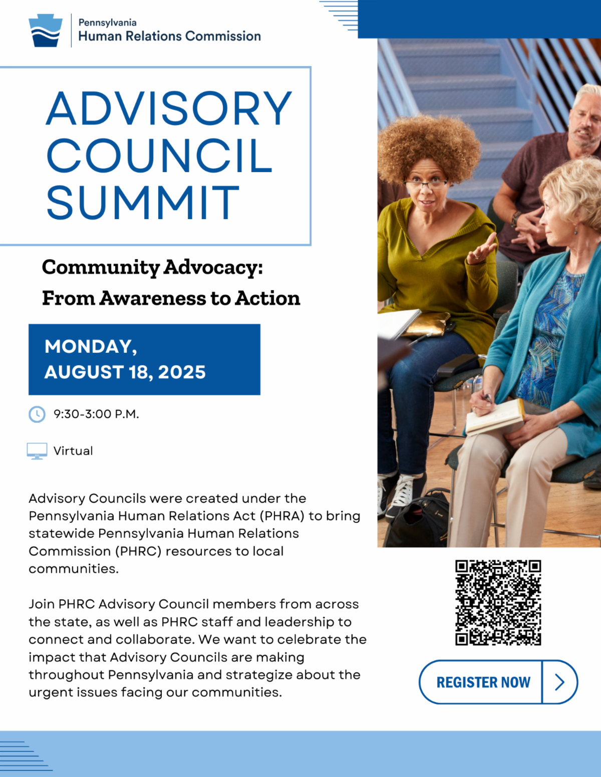 Join PHRC Advisory Council members from across the state, as well as PHRC staff and leadership to connect and collaborate. We want to celebrate the impact that Advisory Councils are making throughout Pennsylvania and strategize about the urgent issues facing our communities.