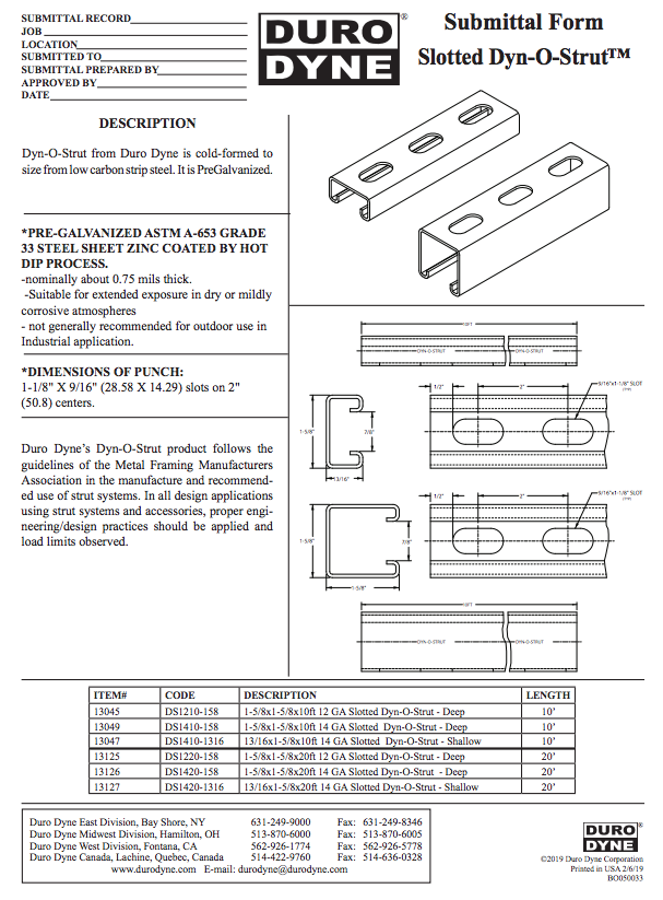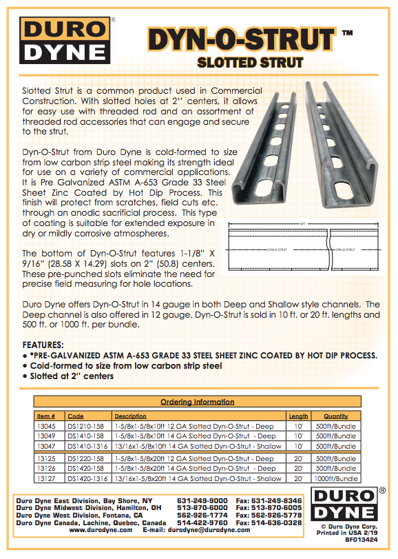 Duro Dyne offers Dyn-O-Strut in 14 gauge in both Deep and Shallow style channels. The Deep channel is also offered in 12 gauge. Dyn-O-Strut is sold in 10 ft. or 20 ft. lengths and 500 ft. or 1000 ft. per bundle.
