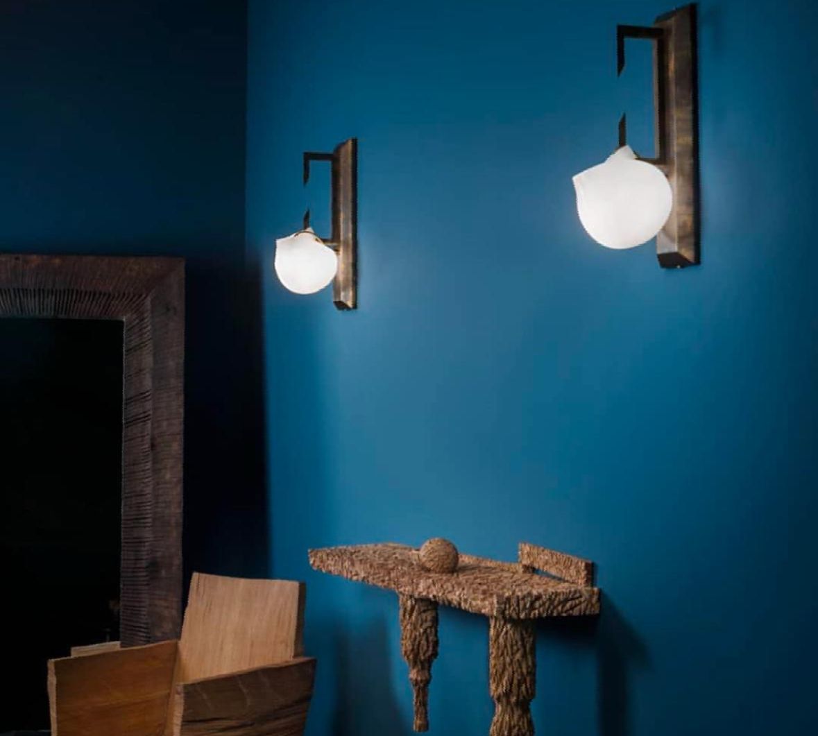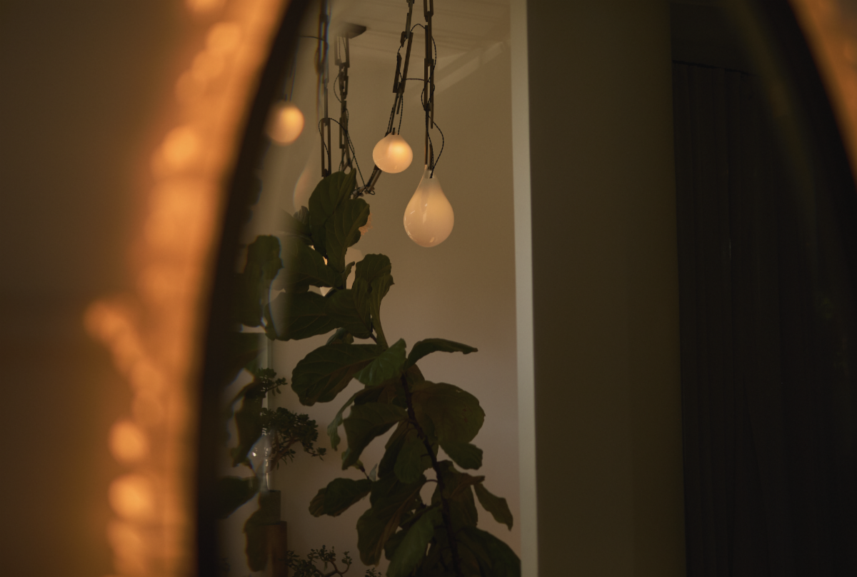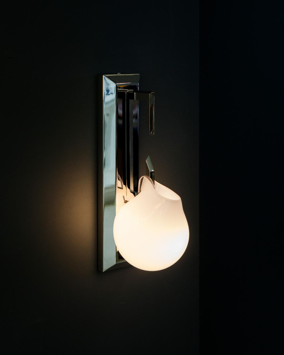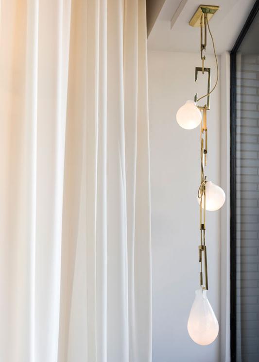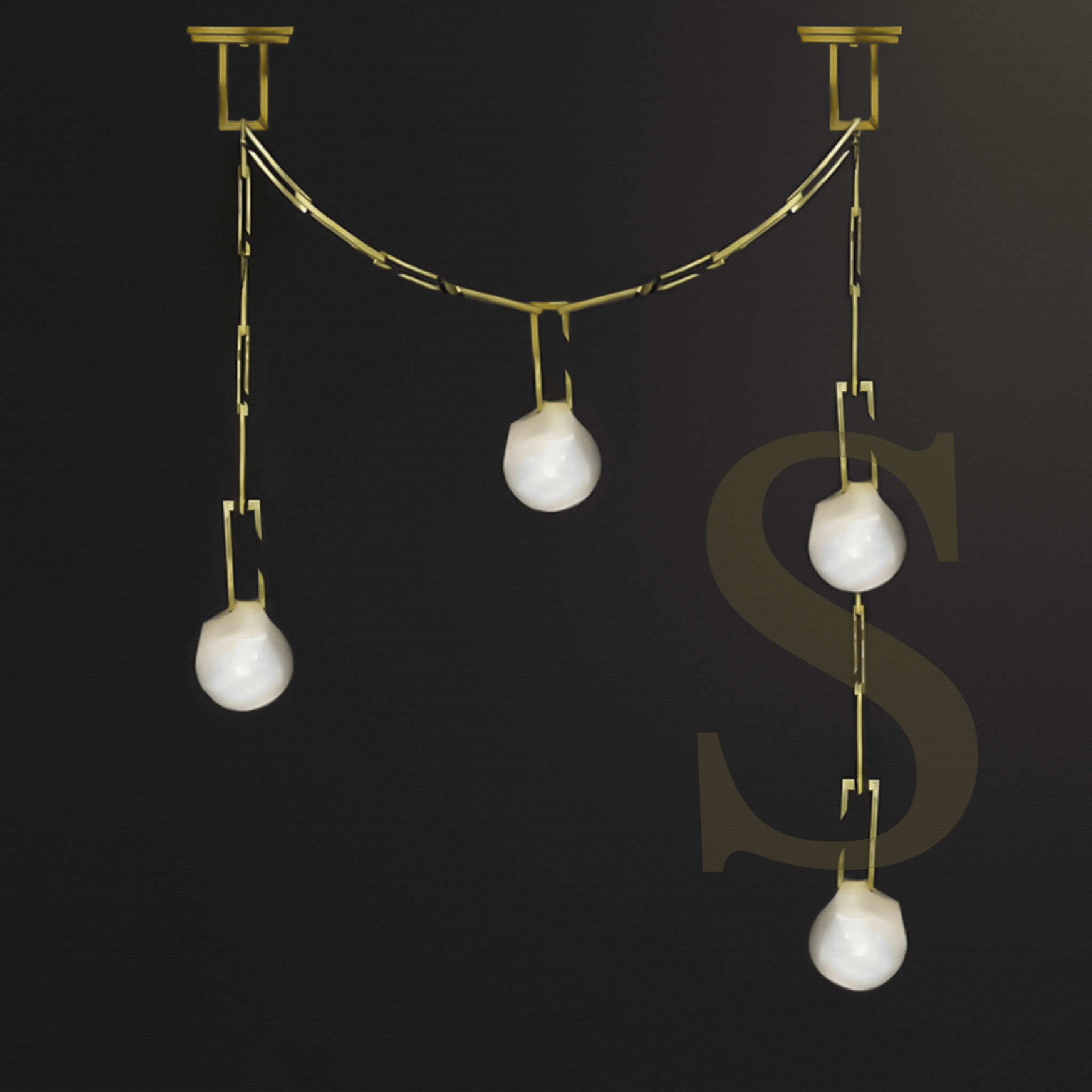 THE SCULPTED, DELICATE SOFTNESS OF THE EXPERTLY HAND BLOWN GLASS GLOBE MAKES A NAME FOR ITSELF AGAINST THE STRICT, GEOMETRIC CHAINS THEY ARE SUSPENDED FROM.