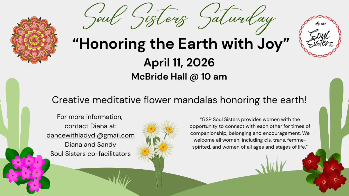 The mission of GSP Faith in Action is to offer personal and spiritual support for those of us who are struggling in the current political climate and to encourage faith-filled and appropriate actions as individuals and in collaboration with other groups. We will meet in the Bloom Room on April 12 (and the 2nd and 4th Sundays from then on) from 11:45-12:45 (note time change); please plan to arrive and settle in at 11:40 as we begin with prayer and a period of silence. At the 4/12 meeting, in anticipation of Earth Day, Stuart Moody from Sustainable Tucson will offer information and opportunities for involvement in local environmental action. At the 4/26 meeting, Margie King will bring us up to speed on migrant ministries. You are most welcome to join us and/or ask to be placed on our email list.