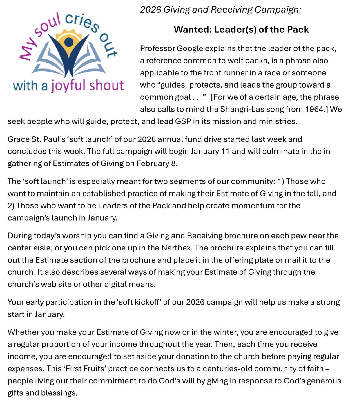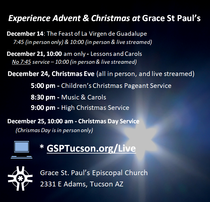 Look for information to come soon about all these upcoming events and, if you would like to suggest materials for consideration or have input into the selected materials, join us in the Bloom Room on Sunday, December 14 at 9:15 a.m. to share your thoughts.