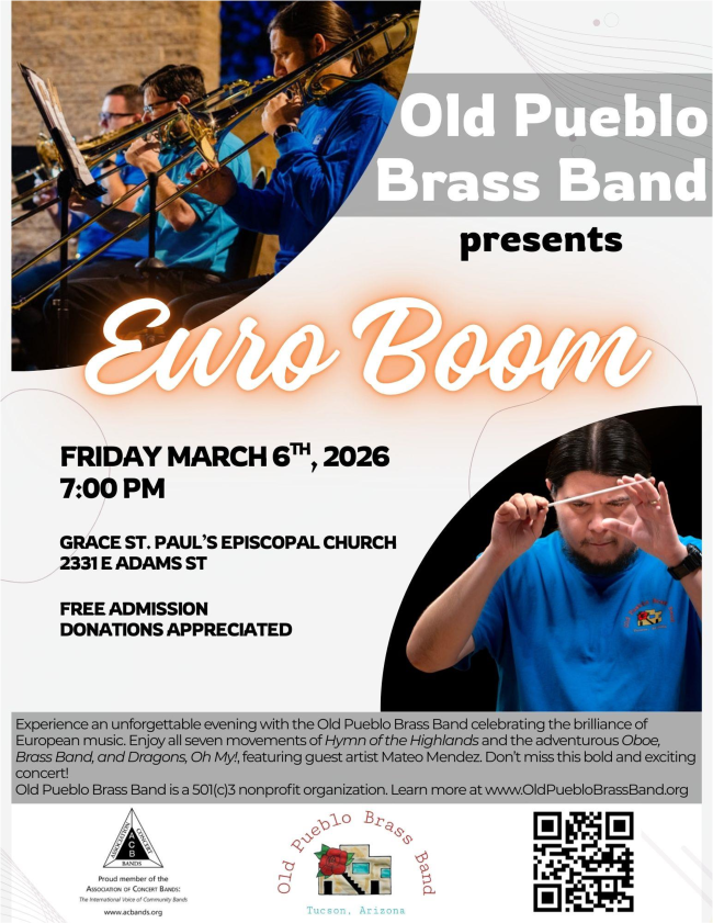 Old Pueblo Brass Band’s 2025-2026 season, titled “Destinations”, features travel and music from various parts of the world. On March 6 "Euro Boom" includes music from all over Europe.