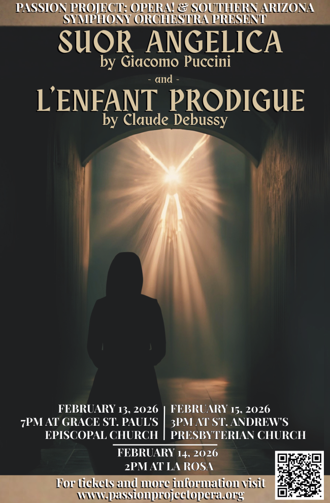 Passion Project: Opera! (PPO), in a first-time collaboration with the Southern Arizona Symphony Orchestra (SASO), is bringing a program of two, brief one-act opera gems to Grace St. Paul's on Friday, February 13th at 7:00 p.m. Puccini’s Suor Angelica and Debussy’s L’enfant prodigue will be set in the Chancel to create the perfect atmosphere for stories of forgiveness and redemption. The cast will feature singers from the GSP family, including Susan Marcus (GSP Interim Choir Director), Barbara Pritchard (GSP choir member and PPO Co-Director) and Korby Myrick (GSP guest keyboardist and PPO Music Director). Linus Lerner, SASO’s longtime Music Director, will be conducting. Tickets for this exciting event can be purchased in advance online by scanning the image’s QR code or at passionprojectopera.org. Don’t miss this opportunity to immerse yourself in an exquisite musical experience that supports the place of nonprofit organizations in our Tucson community!
