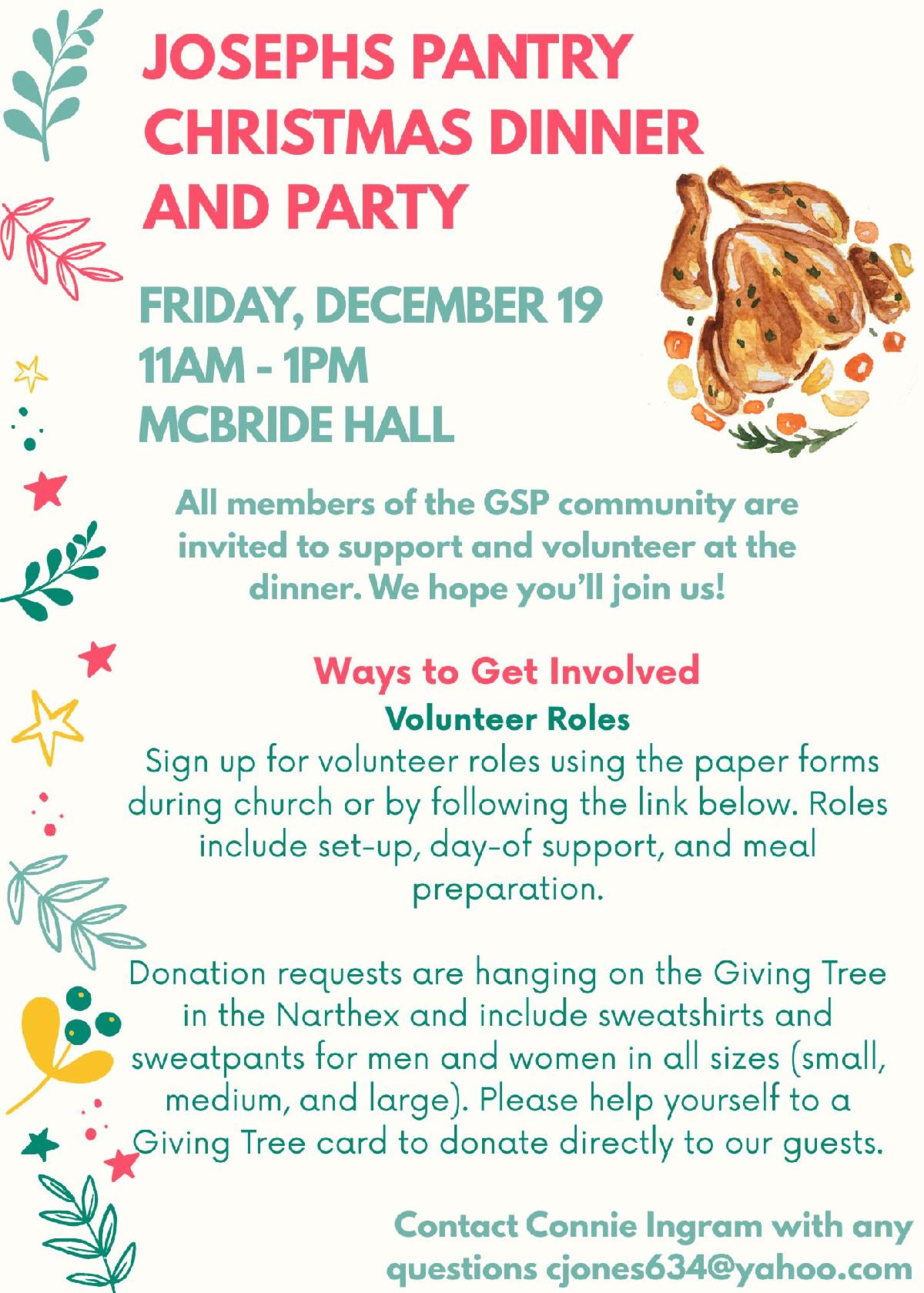 If you would like to sign up for a volunteer role to support the Joseph’s Pantry Christmas Party: Please click here to sign up for a volunteer role! This includes set-up, day-of support, and meal preparation. Many hands make light work!