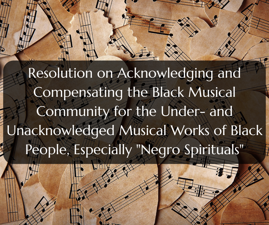 Resolution on Acknowledging and Compensating the Black Musical Community for the Under- and Unacknowledged Musical Works of Black People, Especially "Negro Spirituals" was passed find the resolution here: