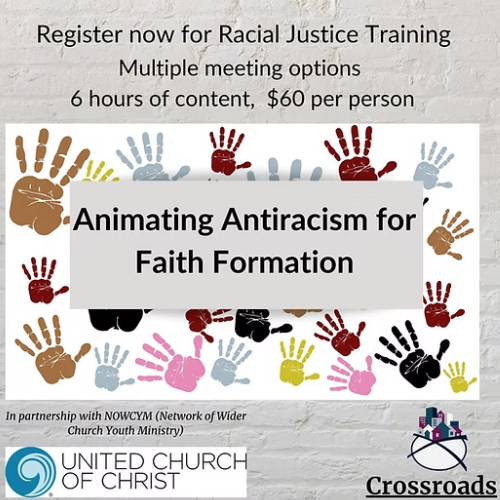 with online cohort sessions for local church staff, lay leaders, and clergy. The Animating Antiracism in Faith Formation program is open to all church leaders who wish to expand cultural competency and examine the ways that race and power are present in ministry. This webinar and cohort series was developed for the United Church of Christ Network of Wider Church Youth Ministries (NOWCYM) by Crossroads Antiracism Organizing and Training.