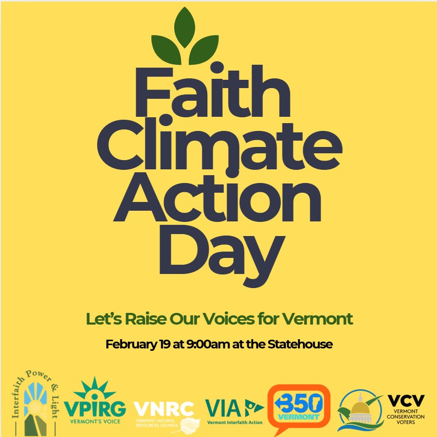 Faith Climate Action Day is a partnership between VT Interfaith Power & Light, VT Public Interest Research Group, VT Interfaith Action, 350 Vermont, VT Natural Resources Council, and VT Conservation Voters.
