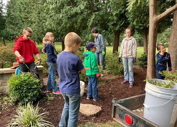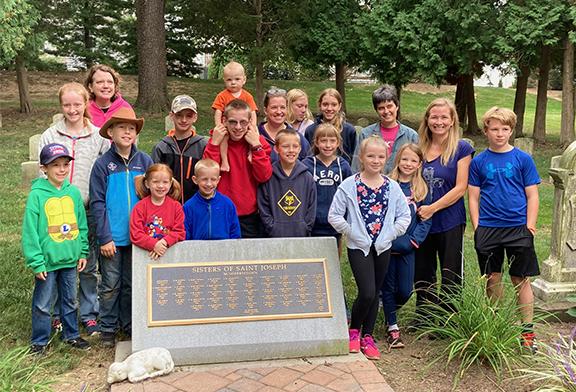 The group included 4 adults and 16 children ranging from kindergarten to middle school. The four families took time from homeschooling to pull weeds and mulch in the Sister of Saint Joseph Cemetery, around Cecilian Village and at the Convent. It was hard work!