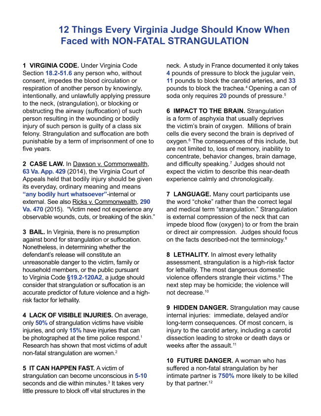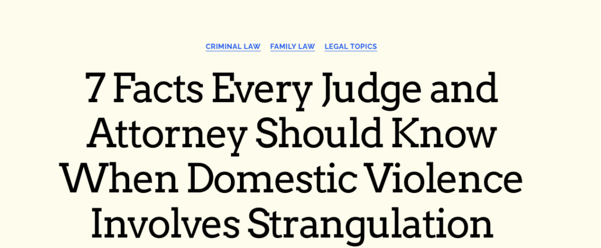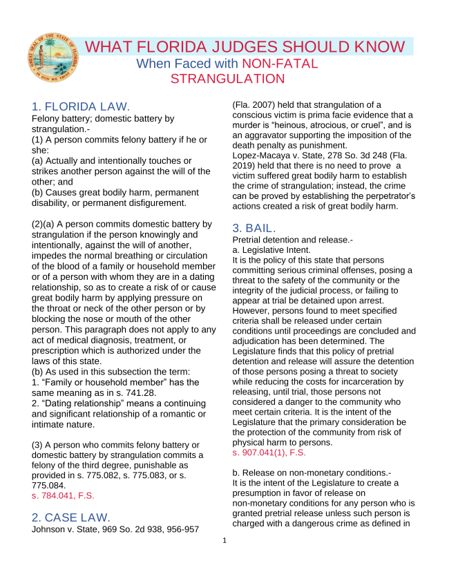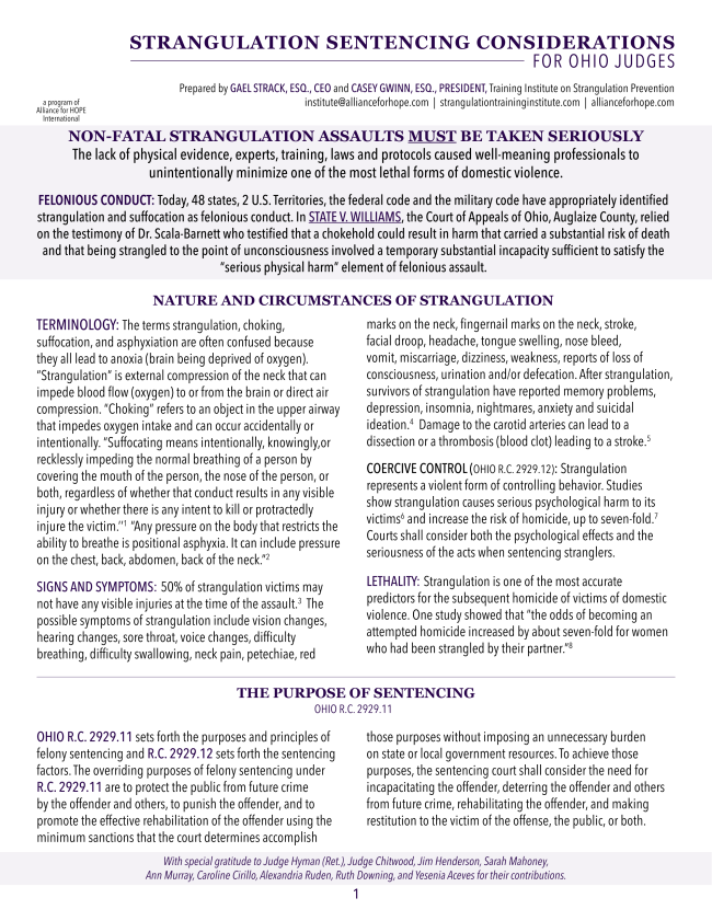 Over the years, our legal advisory team has collaborated with several states, including Florida, Minnesota, Ohio, and Virginia, to develop judicial resources aimed at increasing awareness and understanding the gravity of non-fatal strangulation. These materials are designed to assist judges in identifying appropriate charges and ensuring accountability for offenders who commit these serious crimes.