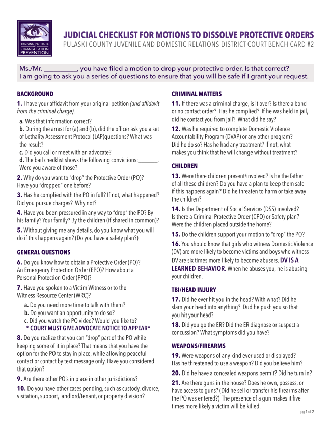 Given the high lethality risk and significant danger posed by non-fatal strangulation, it is imperative that every jurisdiction recognizes its severity and respond accordingly. Individuals who commit these offenses often pose an elevated risk not only to their victims but to public safety as a whole.To support this effort, we have developed different resources titled “What Judges Should Know About Non-Fatal Strangulation.” These tools provide valuable insights into state-specific laws, case law, bail considerations, relevant terminology, signs and symptoms, hidden dangers, key questions judges should consider in court proceedings and so much more.