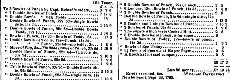 Newburyporters did their best thinking at the Wolfe Tavern, it would seem, and on Thursday, September 26, a meeting was called to organize local resistance to the Stamp Act. The meeting went on all night, and the assembled party put down an amazing amount of alcohol and then stayed for breakfast. The bar bill kept by owner William Davenport's grandson tells the story.