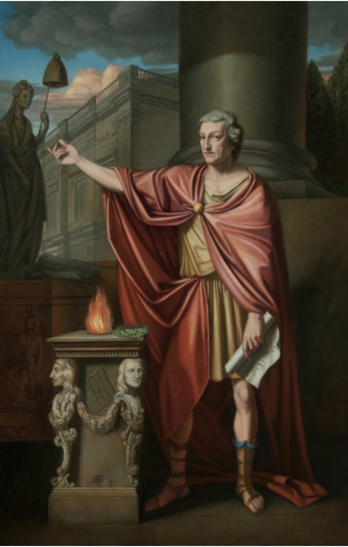 Peale's portrait of Pitt is chock-a-block with potent symbols of smoldering Revolutionary ideals, then still nearly a decade away from full conflagration. Pitt is shown in Classical garb, clutching the Magna Carta, symbol of the liberties enjoyed by Englishmen, while a statue representing Britannia stands on the discarded resolutions of the Stamp Act Congress, colonial leaders who met in New York in 1765 to coordinate opposition to the Stamp Act. America, represented by an armed Indigenous man, stands ready to defend itself.