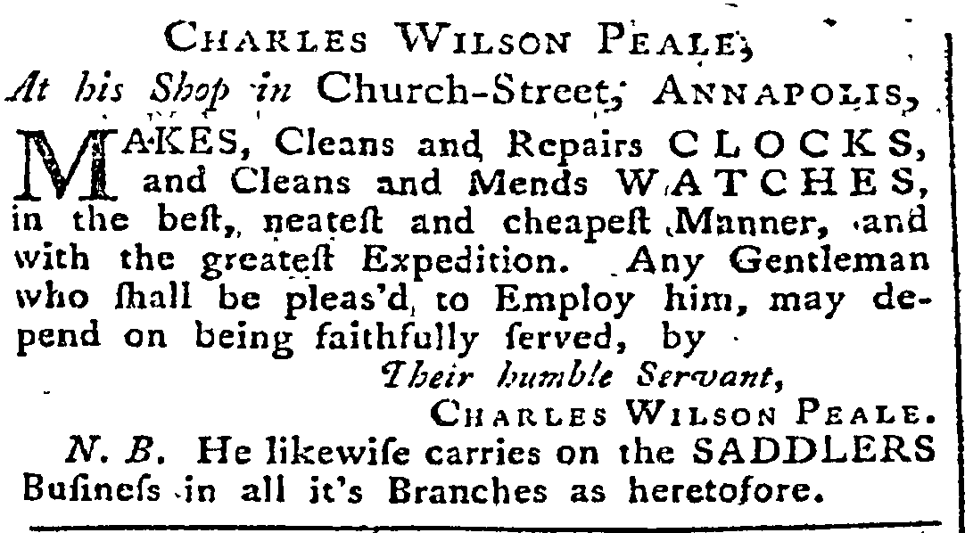 This advertisement for Peale's clock and watch repair and saddle-making business is from the Annapolis Gazette, January 14, 1762.