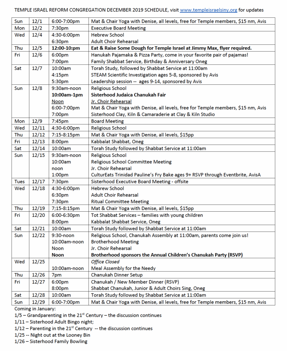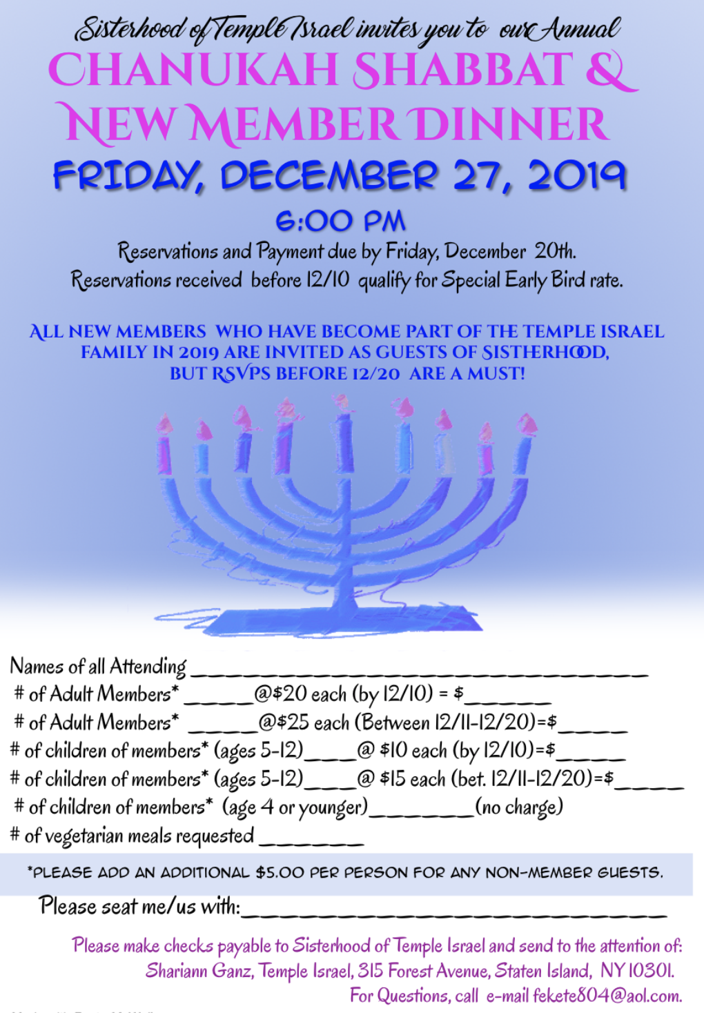 The Chanukah and New Member Supper will be on held on Friday night, December 27 at 6:00 PM. Be certain to bring the family to eat latkes and a delicious traditional Shabbat meal with other Temple Israel families.