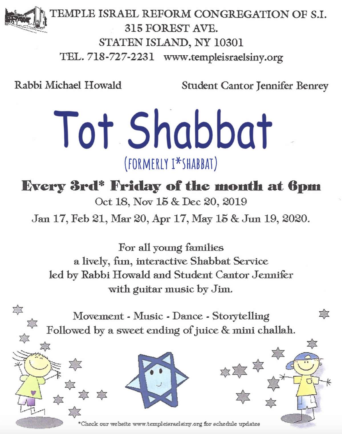Join us for Tot Shabbat on Friday night, December 20th at 6:00 PM. This service is interactive and designed for families with very young children. Rabbi Howald and Student Cantor Jennifer Benrey conduct the service and Rabbi tells a story. The girls and boys enjoy juice and challah at the end of the service.