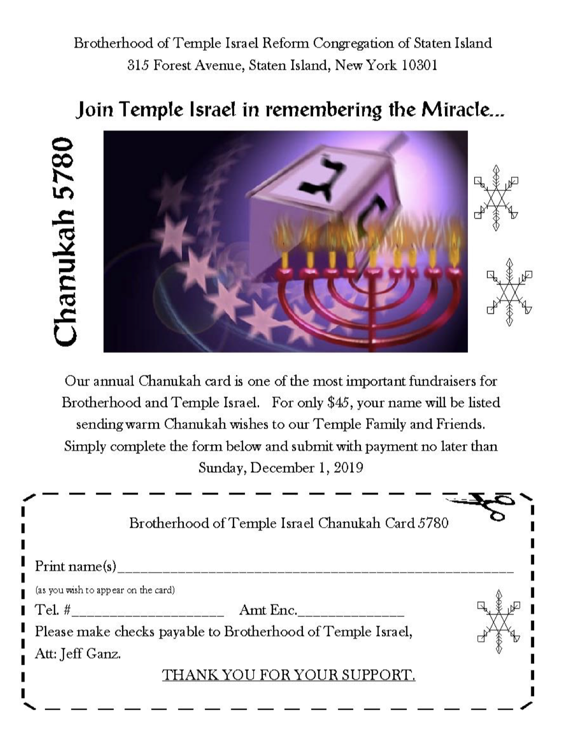 Plans for our Chanukah Card are in full swing and will be ready to distribute to our entire Congregation to wish our fellow congregants a happy Season of Lights. On Sunday December 22 Brotherhood will once again sponsor our children’s Chanukah Party. This is always a fun filled afternoon for the children and parents as we play games, decorate cookies, have crafts and everyone has Pizza and every child receives a small Chanukah present. Please mark your calendars and join us. There is still time to join in both these events. The Chanukah Card and Chanukah Party flyers have been mailed out and are available on the carousel in the lobby or by clicking the appropriate link in this E- Shalom Bulletin.