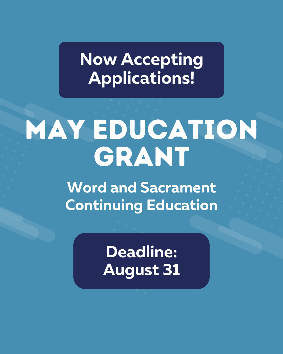 Applications are now being accepted for the May Family Educational Grant, available to rostered ministers of Word and Sacrament in the Florida-Bahamas Synod for continued education. This grant was established through the generosity of Pr. Rusty and PJ, who understand firsthand the transformative impact professional development can have on a pastor’s ministry. Their hope is that others may grow in their professional lives through continued learning. The deadline to apply is this Sunday, August 31. Click here to apply. For questions, please contact Rev. Ana L. Lugo at 904-219-2769 or by email at ana.lugo@elca.org.