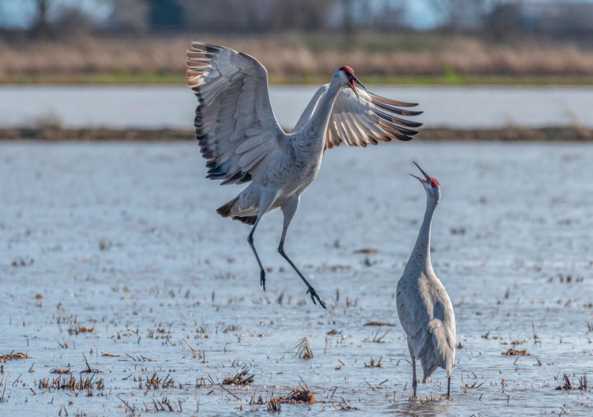Sandhill cranes choose a mate based on their courtship dancing displays. They bow, leap, pirouette, spin, curtsey, and some even toss bits of vegetation or feathers into the air. Once they choose a mate, they stay together for life and, like Canada geese, will co-parent their chicks.
