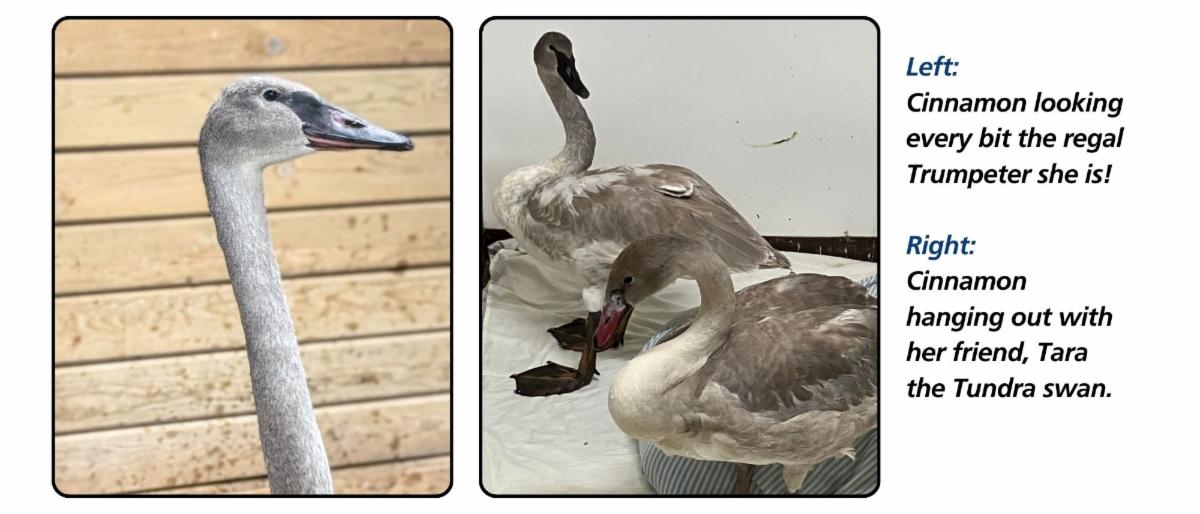 Cinnamon, a juvenile Trumpeter swan, was rushed to us for care after she flew into some power lines and plummeted 25 ft. to the ground below.