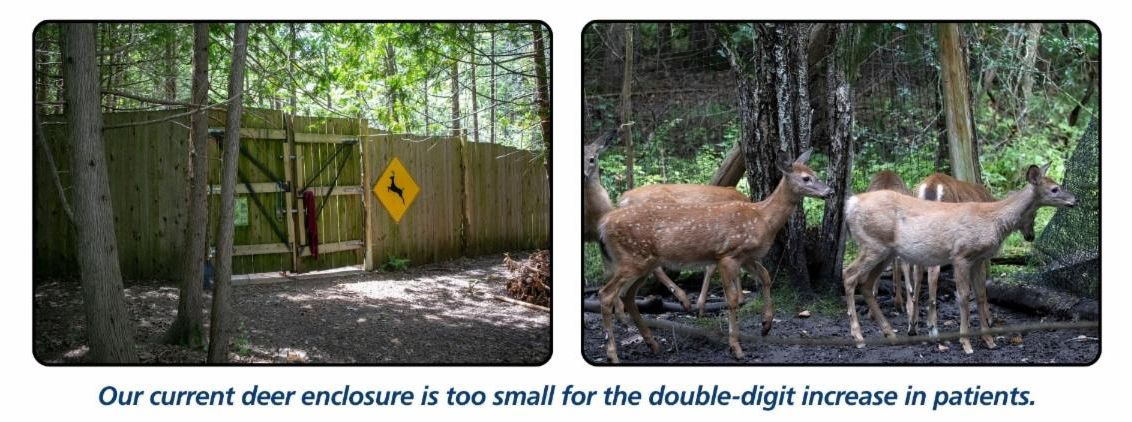 When we first opened our doors in 2013, the area designated for our White-tailed patients was perfect. But since then, the number of injured and orphaned fawns has doubled. We are currently negotiating for the purchase of additional land that will provide the rehabilitation habitat necessary for this high stress species. We’re budgeting approx. $200,000 for this purchase.