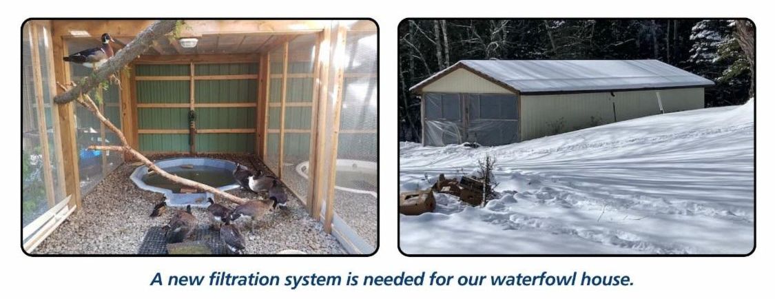 We have four separate pond enclosures, but the plumbing in this building is all interconnected. The pond water needs to be constantly filtered to keep the water clean and contaminant-free. As with our deer enclosure, when we first built the structure, it was fine for the limited number of waterfowl we rehabilitated – but now the number of water birds using this facility has tripled and our filtering system just can’t keep up.