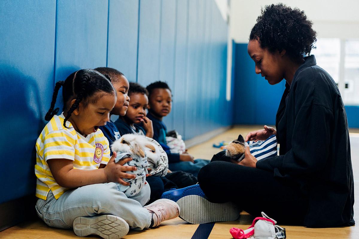 Pictured from left: Anaya, Asante, Jordan and Ezikiel learn about God’s creatures with their teacher, Camila, an Epiphany School graduate from 2005.