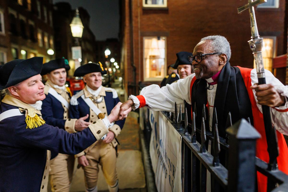 Presiding Bishop Michael Curry greets Lexington Minutemen re-enactors following the Lantern Service celebrating the 300th anniversary of Old North Church in Boston.