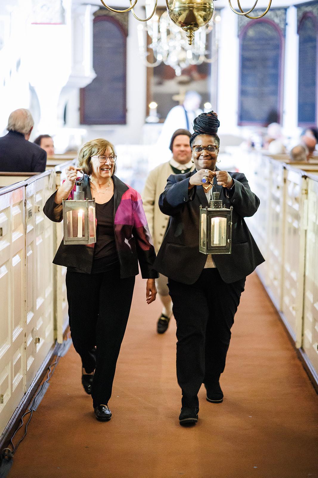 Old North vestry members Anne Sheetz and Nyasha Toyloy carry lanterns to the steeple tower for the symbolic re-lighting of the signal lamps. Photo: Matthew Cavanaugh