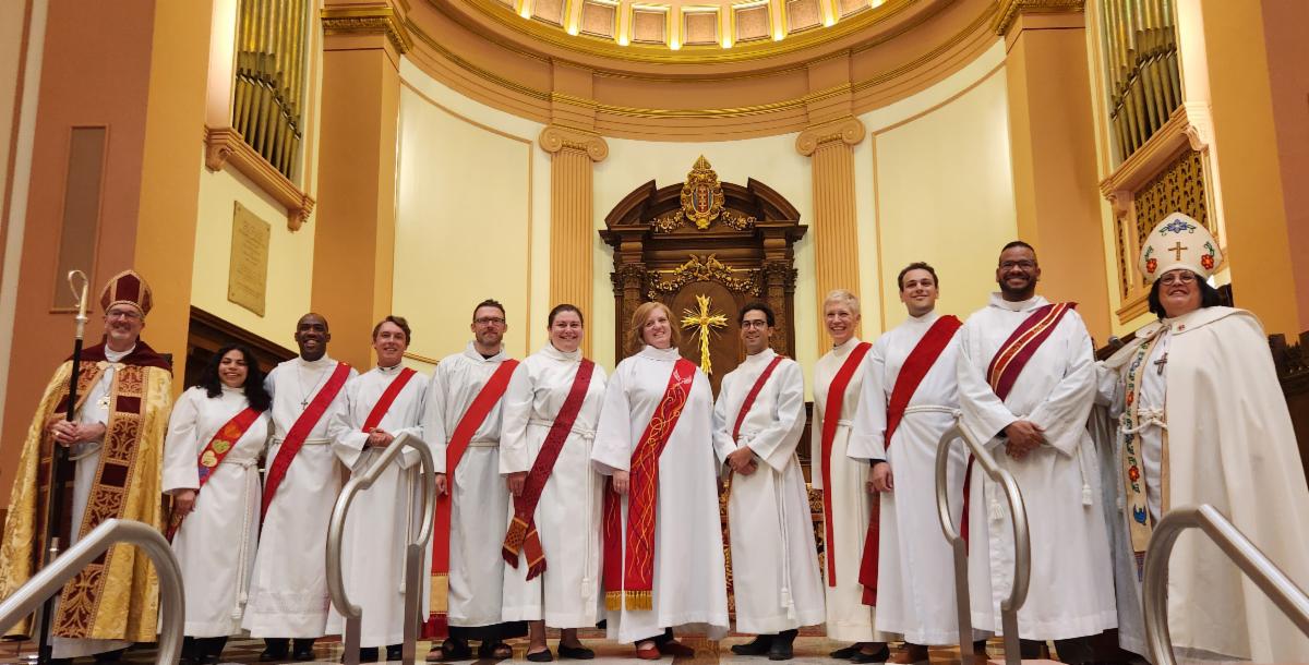 New ordinations to the diaconate: The diocesan community's congratulations are with newly ordained deacon, the Rev. Margaret Lias (above, seventh from left, sponsored by Emmanuel Church, Boston), and transitional deacons the Rev. Eva Ortez ( Cathedral Church of St. Paul, Boston), the Rev. Kevin Vetiac ( Parish of the Good Shepherd, Waban), the Rev. Joshua (Paddy) Cavanaugh (Emmanuel Church, Boston), the Rev. Keith Nelson, SSJE ( Society of St. John the Evangelist, Cambridge), the Rev. Katherine Hoyer ( St. Michael’s Church, Marblehead), the Rev. Paul Keene ( St. Peter’s Church, Cambridge), the Rev. Lisa Faber Ginggen ( Grace Church, Medford), the Rev. Max Sklar ( St. Peter’s-San Pedro Church, Salem) and the Rev. Michael Thompson ( Trinity Church, Melrose), pictured at the Cathedral Church of St Paul in Boston on June 3 with Bishop Alan M. Gates and Bishop Carol J. Gallagher. Courtesy photo